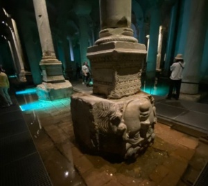 Our final day in Turkey was spent attempting to visit as many places as we possibly could. This began with the atmospheric basilica cistern, which once held the drinking water for the entire city of Constantinople and now serves as a sort of art gallery. The main attraction for me here was the way that it was constructed – designed to be away from human eyes underwater, clearly the architects had simply reused building materials from other places. This led to some bizarre columns, for example those supported by Medusa’s head, or plastered with inscriptions for services long dead.