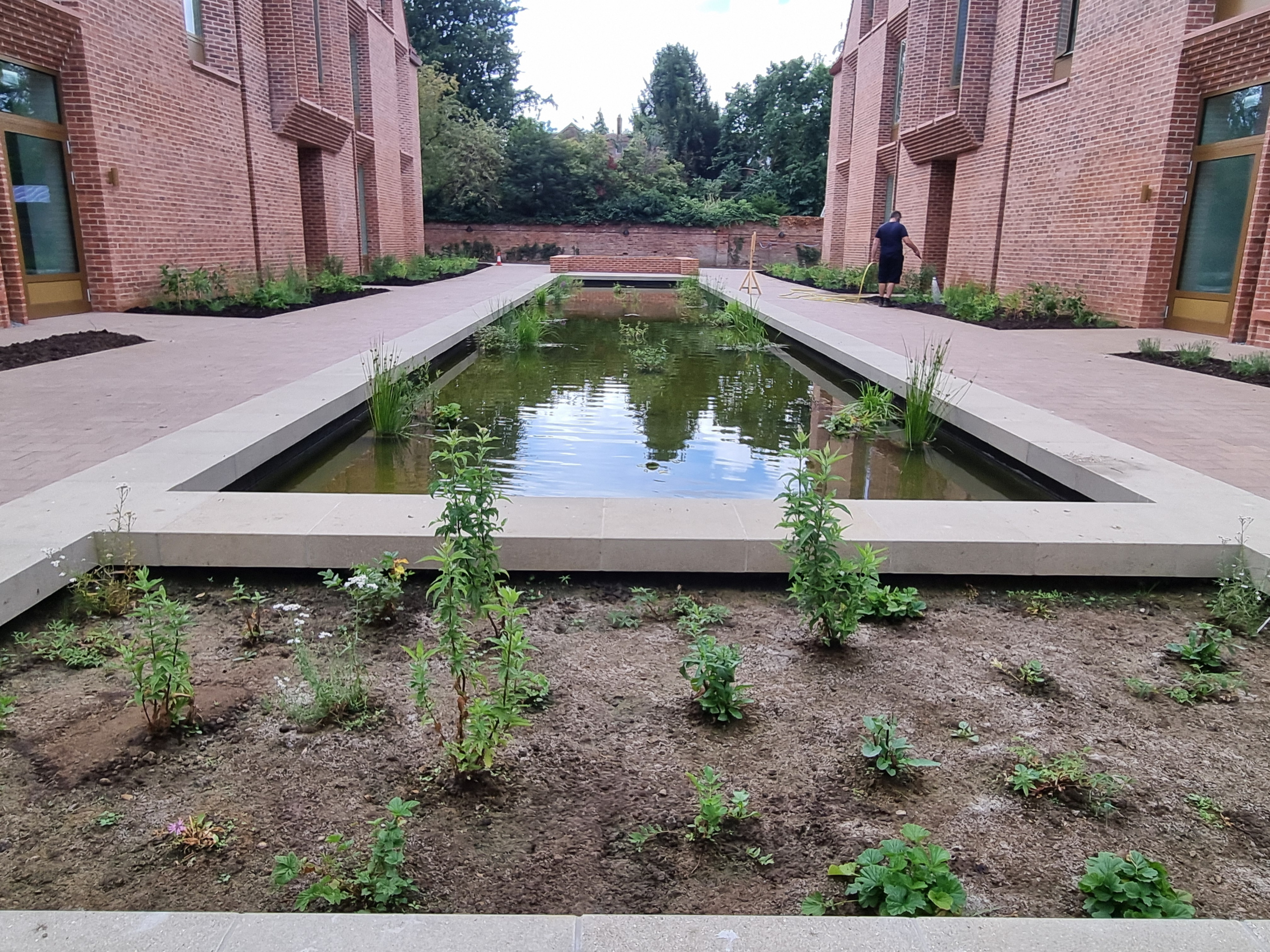 As well as plants, the site will also feature lawns and long grasses. Robbie Eason, Head of Grounds at Univ, has been working with the garden team to sow the first lawn next to Water Court West. Grasses have already been planted on either side of the Water Rill, the striking water feature that sits between Water Courts East and West, providing a sense of movement around the pool throughout the seasons.