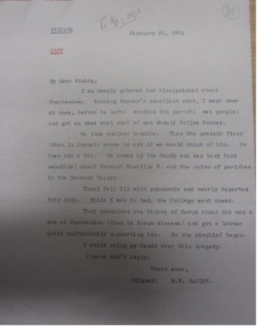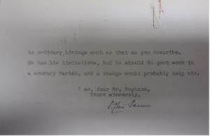Unfortunately, just as the College was now considering Edwards for Checkendon, Sadler fell seriously ill with pneumonia, and could not take an active role in the recruitment process. In particular, there was no opportunity for anyone in the College to interview Edwards to see what they made of him. The Bursar, A. B. Poynton, therefore wrote to Bishop Donaldson to ask his advice on Edwards once more. Donaldson’s reply was slightly cautious in its wording. Having assured Poynton that his doubts about recommending Edwards to Tarrant Gunville did not apply here, he added: “He has his limitations, but he should do good work in a country Parish.”