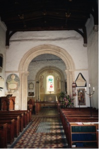 The interior is dominated by two grand arches, separating a chancel and an apse, and there are some striking thirteenth-century wall paintings at the apse (just visible on this photograph).