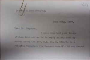 Sadler, perhaps rightly, suspected a stitch-up, in which the Bishop of Salisbury, wary of recommending Edwards to another parish in his own diocese, had few qualms about sending him off to a different one, and cheerfully washing his hands of the man. Writing to A. B. Poynton, the Bursar, shortly after hearing from Strong, Sadler grumbled “we are only gradually getting to know our Sarum!”